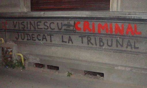 Emellett a ház falára a „Bíróság elé a gyilkos Vişinescuval\" feliratot festették. Mint arról beszámoltunk, a Komminizmus Bűneit Vizsgáló és a Román Emigráció Emlékét Ápoló Intézet (IICCMER) kedden jelentette be, hogy feljelentést tett a bukaresti területi katonai ügyészségnél Vişinescu ellen különös kegyetlenséggel elkövetett emberölés miatt, mivel az általa elrendelt, illetve alkalmazott kínzások miatt több politikai fogoly is elhunyt a börtönben 1956 és 1963 között.