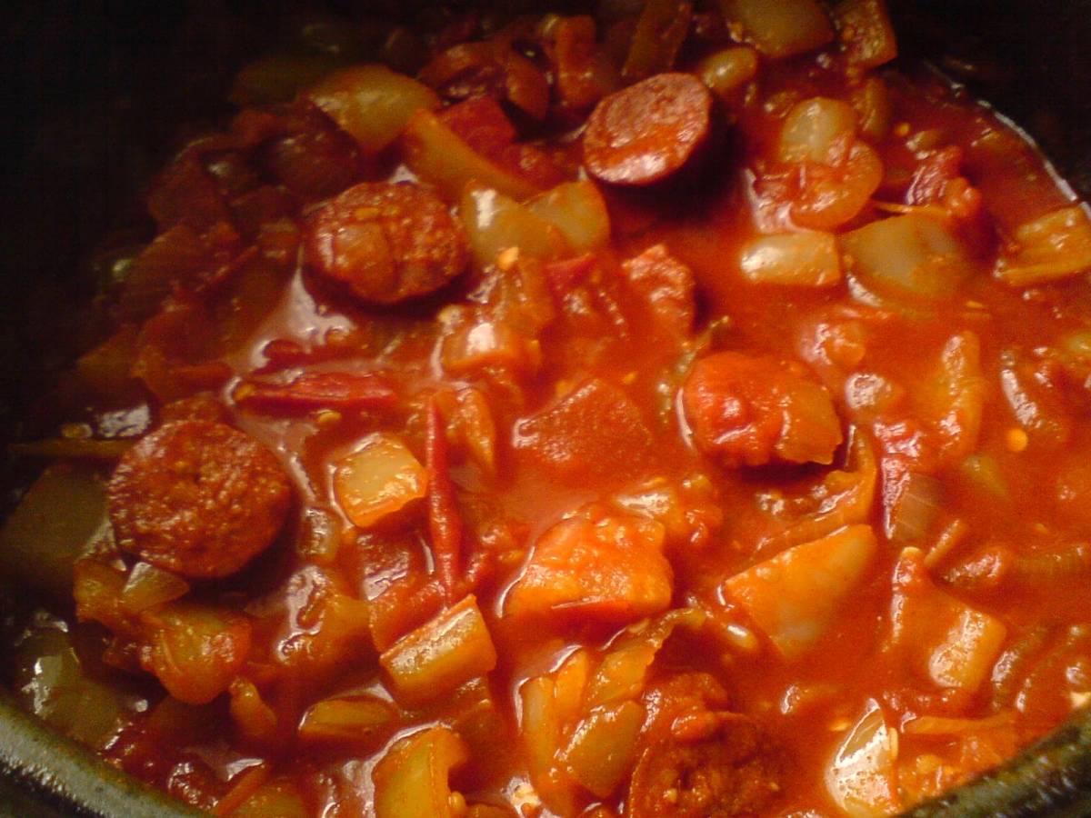 Hozzávalók: 3 nagy db vöröshagyma, 1.5 kg paprika, 1.8 kg paradicsom, 40 dkg parasztkolbász, 1 közepes db hegyes erős paprika, só ízlés szerint, 1 ek. sertészsír.
