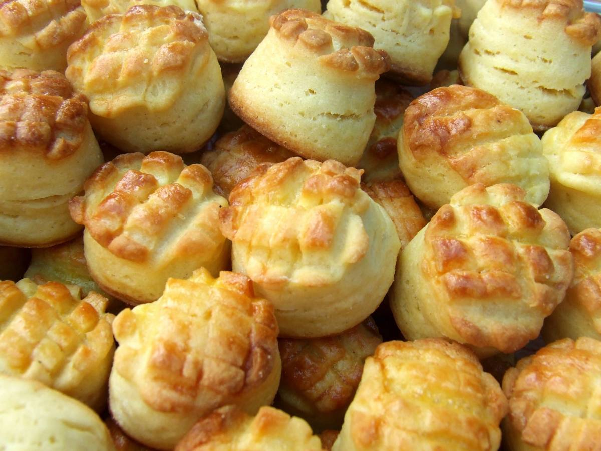 Elkészítés: A tészta hozzávalóit összegyúrjuk, jól kidolgozzuk, fóliával letakarjuk, majd 1 éjszakát a hűtőben állni hagyjuk. Másnap 3 cm vastagra kisodorjuk, tojással lekenjük, sajttal megszórjuk, és pogácsaszaggatóval kiszaggatjuk. 180 fokra melegített sütőben megsütjük.