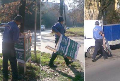 A szövetség alig kezdte el a jelöltek képével ellátott pannók elhelyezését, a városháza alkalmazottai Dorin Florea polgármester rendelkezésére begyűjtötték azokat. A kampánystábok tagjai tegnap hajnalban, nyugat-európai mintára, út menti fatörzseket háromszögbe körülzáró pannókat helyeztek el a városban. Néhány órával később, a délelőtt folyamán az MS 24 MUN rendszámú Daciából kiszálló munkások egyenként valamennyi pannót szétszedték és elszállították.