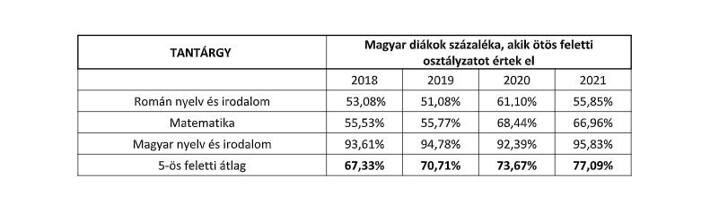 Országos szinten a nyolcadikos vizsgázók 76,8 százaléka, ugyanakkor a magyar nyelven tanuló nyolcadikosok 77,09 százaléka ért el 5-ös vagy 5-ös feletti átlagot. Az oktatási minisztérium adatai szerint 2018-ban 6,17, 2019-ben 2,39, 2020-ban 2,43 százalékos lemaradásuk volt a magyar diákoknak az országos átlaghoz képest, idén viszont 0,29 százalékkal jobb eredményt produkáltak a magyar nyolcadikosok az országos átlaghoz képest.