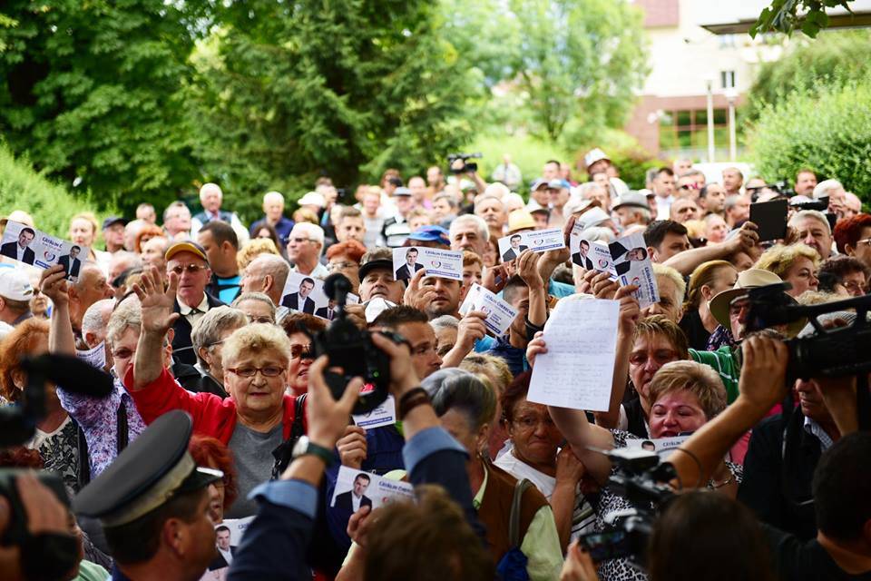 A délelőtt 11 órakor kezdődő eskütétel alkalmából a hivatal előtt mintegy százan fejezték ki szolidaritásukat a polgármesterrel, akit a ceremónia után visszavittek a börtönbe. „Cherecheş ne feledd, Nagybánya a tied!”, „Engedjétek szabadon a polgármesterünket!” – skandálták többek közt a szimpátiatüntetés résztvevői.