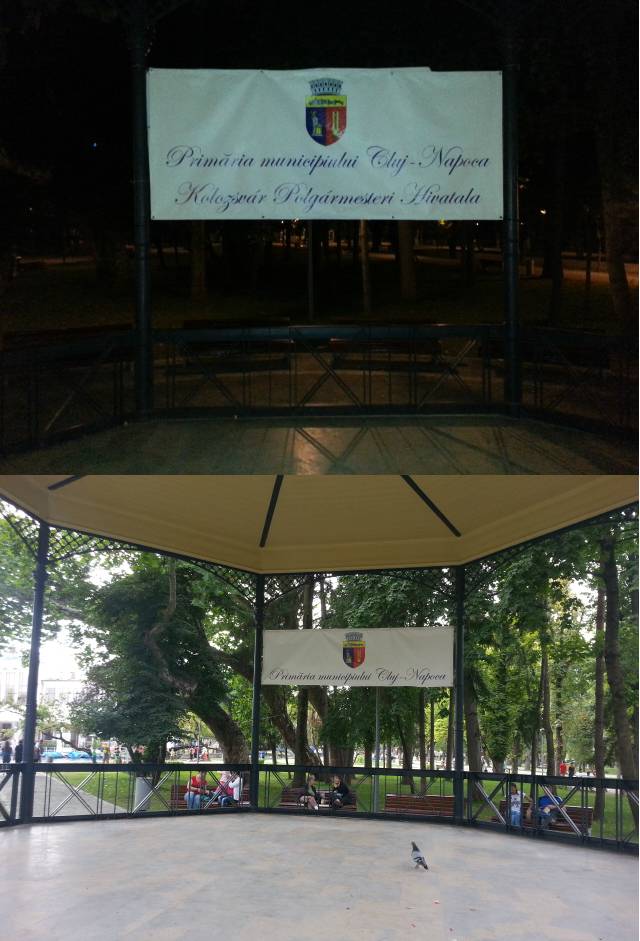Levágták a polgármesteri hivatal munkatársai azt a kétnyelvű bannert, amelyet a MOST–ACUM – Mozgalom a szabad nyelvhasználatért nevű kincses városi civil szervezet aktivistái helyeztek el vasárnap hajnalban Kolozsváron, a sétatéri filagóriában, amely nyáron kedvelt házasságkötő helyszín.