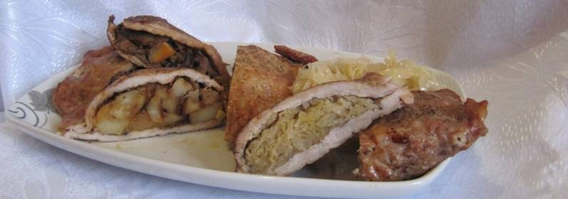 Egyik évben farsang idején kisebb baráti társaságot hívtam vacsorával egybekötött römipartira, és arra gondoltam, hogy valami olyan mókát űzök velük, ami nem annyira szembeötlő. Csodálkoztak is, hogy az előételként tálalt kocsonya mellől nem kacsintgattak szembe az olajbogyós citromzselé-szemek, s a rövidital mellé felszolgált sütemények között sem lelték a boszorkányujjakat. „Megkomolyodtál?” – kérdezgették kissé csalódottan, számítva az ételekben rejlő mókára. „Annyira éppenséggel nem, de még nincs vége a vacsorának” – mondtam, hiszen tudtam, hogy a sütőben szépen pirulnak a meglepetést rejtegető tarjaszeletek. Azt találtam ki ugyanis, hogy a hagyományos hús-káposzta, hús-krumpli, hús-gomba kombinációkat másként tálalom, ezért a főzést a köretek készítésével kezdtem. Vagyis előbb megrántottam a káposztát, külön edényben egy kis hagymás zsírban főtt krumplit dinszteltem, illetve szintén külön csípős „kedvű” gombatokányt készítettem. A tarját jó nagy szeletté klopfoltam, sóztam-borsoztam, egy kis zúzott fokhagymával ízesítettem, majd minden szelet egyik felére a különféle köretekből egy-két kanálnyit halmoztam. A hússzeletek másik felét a köretre hajtottam és fogvájóval letűztem a széleket, majd tepsibe sorakoztattam, egy kis vajat téve mindegyik húsbuci tetejére, és forró sütőben szép pirosra sütöttem. Így minden hússzeletbe más-más töltelék került, a köretmaradékokat pedig melegen tartottam, amíg a hús sült. Volt is nagy meglepetés, amikor vendégeim meglátták, hogy egy-egy húsbuci árválkodik a tányéron! Kérdezték is: „ezt csak így szárazon kell megenni, sehol, semmi köret?” Igyekeztem rezzenéstelen arccal tudomásukra hozni: „ezt biza így, de hozhatok esetleg egy kis savanyúságot”. Hanem amíg a konyhában térültem-fordultam a savanyúságért, vendégeim felvágták a húsbucikat, lett is nagy nevetés, amikor kiderült, hogy a bucik belsejében a köret van, nem a már ismert sajt-sonka kombináció. Ráadásul mindenkinek más és más. Miután kellően vigadtunk a mókán, azért hoztam még a köretekből, hogy mindenkinek juthasson mindenféléből.