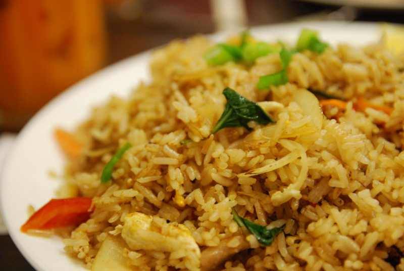 Hozzávalók: 20 dkg hosszú szemű rizs (jázmin vagy basmati), 2 tojás, 2 fej hagyma, 1 csokor zöldhagyma, 1/2 ek barnacukor, 3 cl száraz sherry, 3 cl szójaszósz, 3 cikk fokhagyma, 1 ujjnyi gyömbér, 2 ek szezámolaj, 1-2 ek halszósz, 1,2 dl olaj, és esetleg 1-2 tk chilipehely