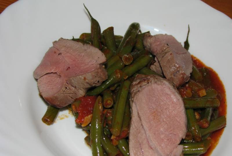 Zsenge, frissen szedett ceruzababot használok az elkészítésére.Ezt megmosom, megtakarítom, egyforma hosszúságúra tördelem, majd előfőzöm sós vízben.Egy edénybe vajon apróra vágott fokhagymát és hagymát párolok meg, hozzáadok hámozott és kockázott paradicsomot (szoktam használni a hántolt, kockázott paradicsomkonzervet is), fűszerezem majoránnával és őrölt fekete borssal, rakok bele kevés cukrot a savassága miatt, majd zutty bele a szeletelt, főtt, előkészített nyelvet. Hozzáadom az előfőzött zöldbabot, és további 15-20 percig összefőzöm. Tollhegytésztával (pasta penne) tálalom.