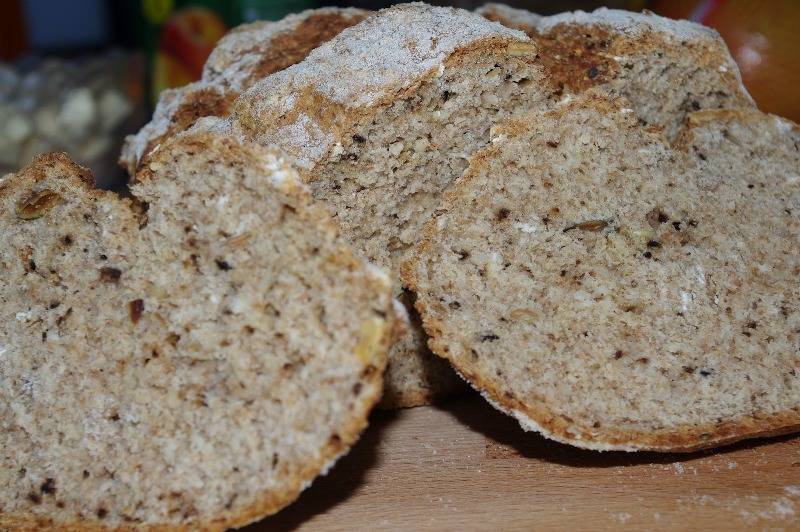 Elkészítés: a száraz hozzávalókat összekeverjük, majd annyi tejet öntünk bele, hogy formázható, nem túl ragacsos tésztát kapjunk. Sütőpapírral bélelt tepsibe lapos cipót formálunk, és 200 fokon 30-40 perc alatt megsütjük. Kicsit hűlni hagyjuk, majd szeleteljük.