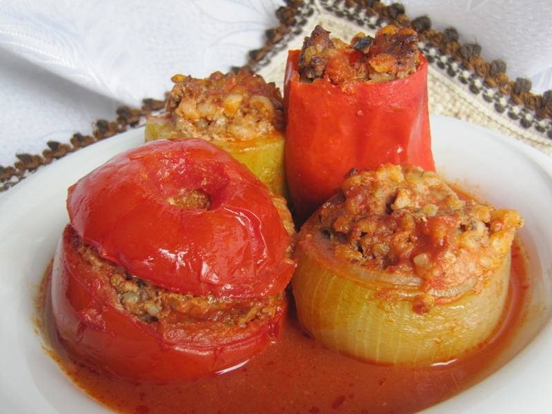Bonyhádi barátokat láttam vendégül a minap, és mielőtt érkeztek volna azon morfondíroztam, milyen étellel is kínáljam meg őket. Nem akartam a szokásos vendégváró menüsort az asztalra tenni – húsleves, flekken szalmapityókával és savanyúság –, mert feltételeztem, hogy ilyesmit otthon is esznek, de nem akartam olyan székelykedő fogásokkal sem előállni, mint a túróspuliszka és a töltött káposzta. Nem akartam olyan ételt sem tálalni, ami frissen jó, mert az ilyen étellel – tapasztalatból tudom – megjárhatja az ember. Egyrészt időigényes, nekem pedig munkanap lévén, a főzésre szánt időből volt a legkevesebb, másrészt macerás frissen tálalni úgy az ételt, hogy bizonytalan a vendégek érkezésének időpontja. Valami olyat kellett találnom, ami finom, laktató, idénynek megfelelő, ráadásul viszonylag sokáig frissen tartható, illetve újramelegítve sem veszít az élvezeti értékéből. Azt tudtam, hogy amolyan előételféleségnek készítek egy padlizsánkrémet és desszertként ropogós cseresznyét teszek az asztalra. A főétellel volt gondom, ezért elvonultam morfondírozni a kamarába, majd szélesre tártam a hűtő ajtaját, és a kihúzott fiókok előtt is gondolkodtam egy sort. Ezt nem úgy kell elképzelni, mint Micimackó gondolkodó-sarkát a Milne regényben, egyszerűen édesanyám mindig kéznél lévő intelmét alkalmaztam, miszerint „az ebéd megtervezésénél mindig abból indulunk ki, mi éppen kéznél van”. Nos, volt a hűtő fiókjában két nagy paradicsom, egy kisméretű tök, két kápiapaprika és két zöldpaprika, a kamarában pedig hagyma, és találtam még fél liternyi sűrű paradicsomlevet. Innentől már sokat nem kellett gondolkodnom, mert a meglévő alapanyagok sugallták az ötletet: dolmát fogok főzni! Dolmát életemben először egy örmény rendezvényen ettem, de az szőlőlevélben töltött húsos-rizses töltelék volt, némi mazsolás besamellel leöntve, és a gyergyói örmények nagyon büszkén vallották, hogy az az ő ételük. Aztán kicsit utánaolvastam és tanácskoztam néhány gasztronómussal, így megtudtam, hogy a dolma török eredetű étel és gyűjtőneve minden rizses és/vagy húsos töltelékkel töltött zöldségnek. Örültem ennek az információnak, mert ebből kiderült az is, hogy „szabad kezet kaptam”, és elkészíthetem akár a saját változatomat is.