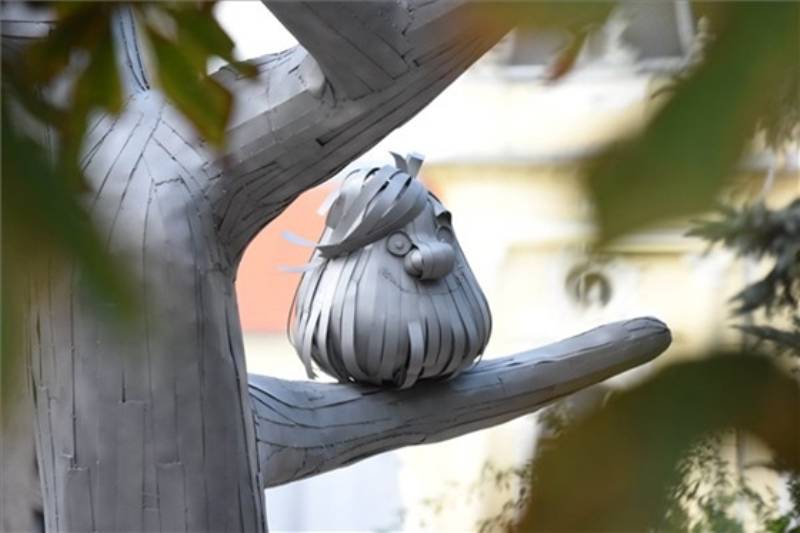 A frissen felavatott szobor a legendás mesehőst ábrázolja – Pom Pom egy négy és fél méteres acéllemezekből készült fán csücsül, és rozsdamentes krómacélból készült. Pintér Attila szobrászművész elmondta, munkájukat Csukás István szülőházának utcájában állították fel, stílusosan egy általános iskolával szemben. Mint a település polgármestere, Kecze István az MTI-nek kiemelte, a szobor a Nemzeti Kulturális Alap és az önkormányzat támogatásával készült, s terveik között szerepel egy Süsüről, a sárkányról elnevezett játszótér kialakítása is a településen, ahol a mesefigura alakját jelenítenék meg.