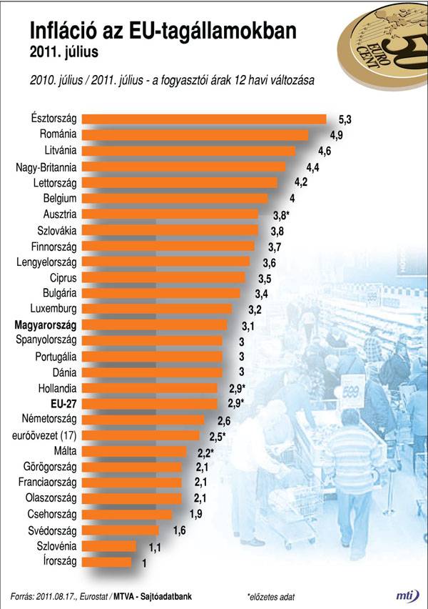 Az infláció éves üteme 16 EU-tagállamban csökkent, kettőben stagnált, és hétben nőtt. A közös valuta térségében éves szinten 5,5 százalékkal nőttek a közlekedési tarifák, miközben a lakóingatlanok 5,0 százalékkal, a szeszes italok és dohánytermékek pedig 2,9 százalékkal drágultak. A legnagyobb éves csökkenés a ruházati termékeknél (–2,9 százalék) és a telekommunikációs díjakban (–1,6 százalék) volt. Az energiaárak havi szinten 0,8 százalékkal, míg éves szinten 11,8 százalékkal emelkedtek júliusban.