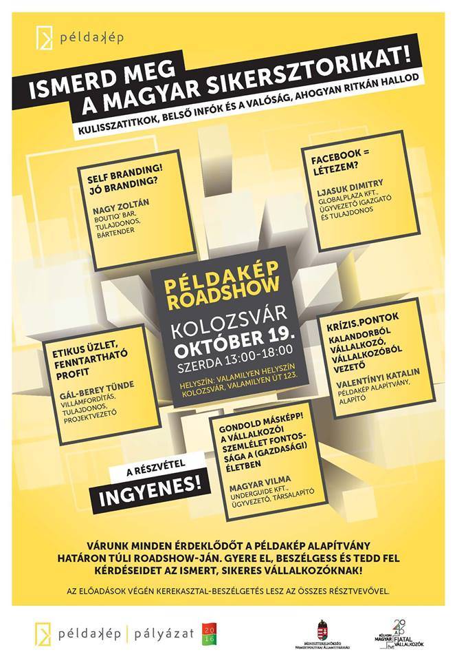 A 2016 a külhoni magyar fiatal vállalkozók éve program körútja keretében ezúttal a Példakép Alapítvány magyarországi példaképeinek előadását hallgathatják meg az érdeklődők. Október 19-én Kolozsvárott, október 20-án Csíkszeredában, október 25-én Dunaszerdahelyen, október 27-én Zentán, november 3-án Beregszászon lesznek előadások.