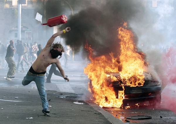 Legalább hetven ember megsérült – köztük 30 rendőr –, amikor tüntetők és rendőrök csaptak össze Róma központjában, ahol a legtöbben gyűltek össze a szombatra és vasárnapra világszerte meghirdetett, a cégek kapzsisága és a politikusok tehetetlensége miatt tiltakozó demonstrációk közül. A rendőrök könnygázzal, vízágyúkkal, gumibotokkal oszlatták az üzleteket, autókat, pénzkiadó automatákat rongáló randalírozókat, akiket a békésen demonstráló többség is igyekezett nyugtatni.