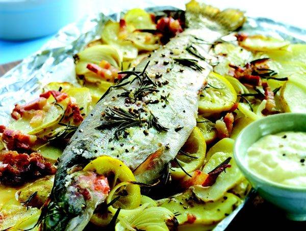 Hozzávalók:  személyenként 1 pisztráng, citrom, olívaolaj, fokhagyma, zsálya, bazsalikom, petrezselyemzöld, só, bors; illetve személyenként 4-5 apró krumpli, só, bors, rozmaring, pár csepp balzsamecet. A mártáshoz: 2 evőkanál liszt, kevés vaj, petrezselyemzöld, tej, só, bors.