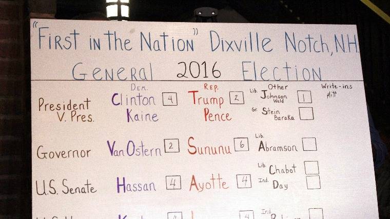 A kicsiny Dixville Notch félúton fekszik Maine állam és a kanadai határ között, és összesen tizenkét lakója van. Minden elnökválasztáskor ez az első település, ahol voksolnak. Ez hagyomány, mégpedig 1960 óta, amikor a település mind a kilenc voksát Richard Nixonra adta le. A másik településen, Millsfieldben Donald Trump aratott elsöprő győzelmet: a huszonegy szavazatból tizenhatot szerzett, míg Clintonra négyen voksoltak, és valaki felírta a szavazócédulára Bernie Sanders vermonti szenátor nevét, aki a demokraták elnökjelöltségéért küzdött, de mivel nem ő lett az elnökjelölt, nem szerepelt a szavazócédulán. New Hampshire harmadik kicsiny településén, Hart\'s Locationben harmincegy szavazó él. Tizenheten Clinton mellett döntöttek, tizennégyen Trumpot választották. Mivel New Hampshire államban kormányzót is választanak, e három településen is voksoltak kormányzóra, a győzelem a republikánus Chris Sununué lett.
