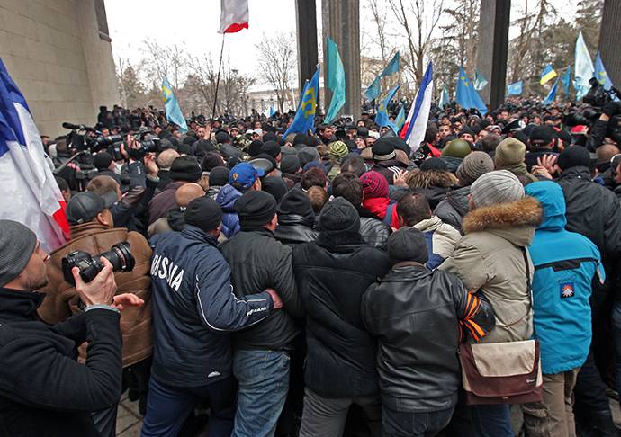 Az autonóm terület parlamentje előtt két ellentábor kezdett tüntetést: a kijevi hatalomváltást támogató krími tatárok és az azt ellenző oroszbarát csoportok. Előbbiek közel ötezren vonultak a parlament elé, utóbbiak a megmozdulás kezdetekor néhány százan voltak, de helyi jelentések szerint létszámuk gyors ütemben növekszik.