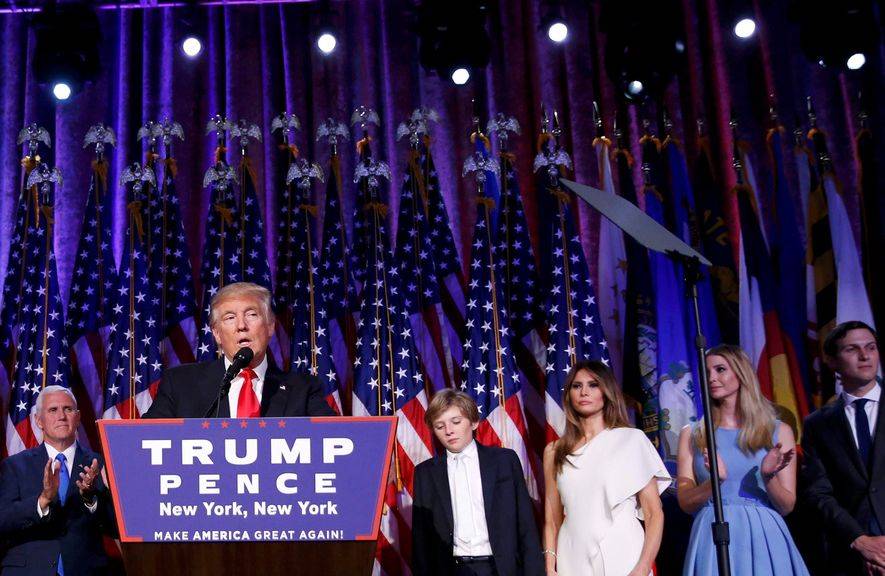 Miután Hillary Clinton elismerte vereségét és telefonon gratulált Donald Trumpnak, a republikánusok immár megválasztott elnöke megvárta, amíg az elnökséghez szükséges 270 elektori szavazat hivatalosan is megvan, s ezután lépett – családja körében – hívei elé. Mielőtt elmondta volna rövid beszédét, Mike Pence, Indiana kormányzója és a leendő alelnök szólt az egybegyűlt ünneplőkhöz. Donald Trump vezető képességeire, erejére és vízióira utalva leszögezte: Trump vezetésével és elképzeléseivel Amerika ismét nagy lesz.