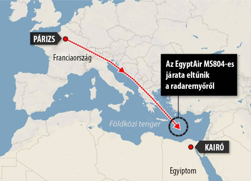 Az Egyptair egyiptomi légitársaság Párizsból Kairóba tartó MS804-es járata nem sokkal a leszállás előtt a Földközi-tengerbe zuhant. A gép fedélzetén 56 utas és tízfős személyzet tartózkodott, senki sem élte túl a katasztrófát. Az utasszállító nem adott le vészjelzést az ütközés előtt.