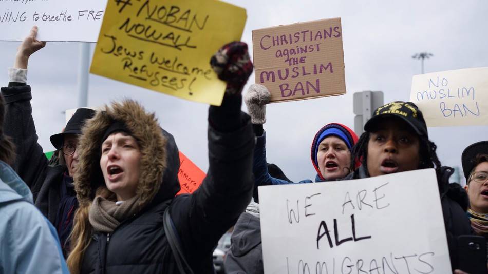 A bevándorlást átmenetileg korlátozó elnöki rendelet ellen vasárnap ezrek tüntettek az Egyesült Államok egyes nagyvárosaiban és repülőterein. Több ezren tüntetnek Detroitban, Chicagóban, New Yorkban, Dallasban, Los Angelesben és több százan protestálnak Washingtonban, a Fehér Ház előtt is. A chicagói O\'Hare repülőtéren és a Dallas melletti Forth Worth repülőterén a feltartóztatott, de az ellenőrzések után a reptérről kiengedett utasokat ünnepelték a protestálók, a tranzitból kiérkezőket győzelmi jeleket formálva és hurrázással fogadták.