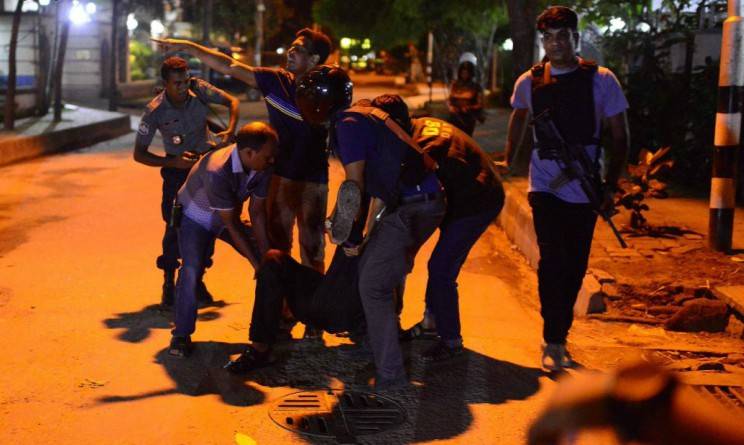 A terroristák azonban addigra huszonhárom túszukkal végeztek, az áldozatok többsége külföldi volt, elsősorban olasz és japán állampolgár. A nyolc támadó péntek este előbb tűzpárbajt vívott a biztonsági erőkkel, majd behatolt a Holey Artisan és az O,Kitchen nevű étterembe, Gulsan diplomatanegyedben, és túszul ejtették a bent lévő mintegy harmincöt embert.