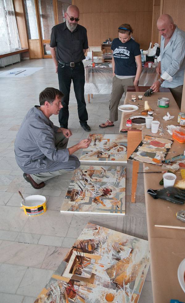 Dóró Sándor harmadjára vesz részt a táborban. Drezdában végzett festő és grafikus szakon, és jelenleg, mint mondta, három otthona van, hiszen Drezdán kívül Magyarországon is lakik, de Erdélyben is „otthon érzi magát”. „Két évvel ezelőtt látogattam el először Erdélybe, ez nagyon fontos tapasztalat volt számomra, és voltak ismerőseim, akikről tudtam, hogy idén részt vesznek ebben a táborban. Velük szerettem volna együtt alkotni” – magyarázta Dóró, aki elmondása szerint sorozatokat készít. „A nemes eszközök lehetőségeit kutatom, a korszerű akrilfesték és a papír találkozásából születnek a munkáim, amelyek nincsenek előre megtervezve, a saját lábnyomomból következtetem ki, mikor állok meg. A képek a pillanat fogságában készülnek, aztán elrendezem, sorba rakom őket” – fogalmazott a képzőművész.