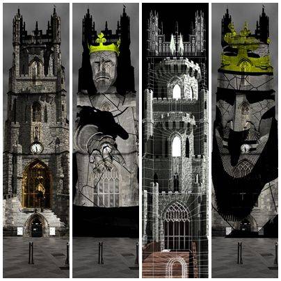 A Montgomeryben I. Eduárd angol király által máglyára küldött 500 bárd legendájának stilizált képi megjelenítését látványos, színes fényfestéses technológiával vetítették a XII. században épült cardiffi Keresztelő Szent János templom tornyára.