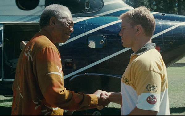 Mesterien illusztrálja mindezt a nyitójelenet, amelyben a Robben-börtönszigetről frissen szabadon engedett Mandelát szállító konvoj útvonalának egyik oldalán egy rozsdásodó drótkerítés szegélyezte, poros földdarab található, amelyen rongyos fekete gyerekek fociznak lelkesen, szemben velük pedig jókora fémkerítés védte rögbipálya terül el, amelyen a néger szabadságharcos szabadlábra helyezését a közelgő apokalipszis jeleként értékelő fehérek tartanak rögbiedzést.