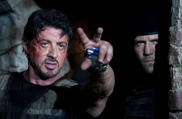 Hogy is ne imádnák, amikor végre egy jelenetben láthatják a szétplasztikázott arcú, de még mindig dagadó bicepszű Stallonét Schwarzeneggerrel, amint nem egy kisebb hadseregnek is elegendő fegyverarzenállal rontanak egymásnak, hanem, szellemi fölényüket bizonyítandó, élcpárbajt vívnak, amelyhez Bruce Willis asszisztál. Itt hangzik el a film egyik legjobb poénja: Willis azzal nyugtatja Stallonét, hogy Schwarzeneggert nem kell komolyan venni, csupán azért olyan, amilyen, mert elnöknek készül. (A másik, a mi szívünknek kedves poén az, amikor a két főszereplő, a veterán zsoldosok vezetői, Stallone és Statham Buda és Pest álnéven mutatkoznak be összekötőjüknek).