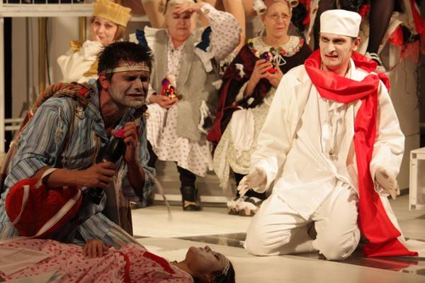 Egyébként ő a legtisztább elme, bár történik utalás arra, hogy voltak némi francia királynői (szerep)álmai, de felgyógyult. Dr. Hiúz normalitásáért nem tenném tűzbe a kezem, de van egy zseniális ötlete: a meg nem kapott szerepek utáni vágyba belehülyült színészekből társulatot verbuvál és karmesteri pálcáját lóbálva mondatja mindenkivel a magáét. Ők pedig mondják. Mit mondják, fújják ha kell, ha nem a világot jelentő deszkákon soha el nem mondott szövegeiket.