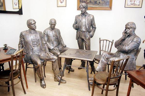 A szobor egyébként egy festmény alapján készült, amely szintén az emlékmúzeumban tekinthető meg – a képen az egykori EMKE – ma Astoria – teraszán üldögélnek a költők az asztal mellett.
