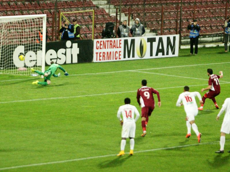 A kapott gól után a hazai együttes sorra vezette egyre veszélyesebb támadásait. Előbb Ivanovszki hagyott ki egy ajtó-ablak ziccert – egy lövőcsellel elfektette a kapust, majd centikkel az üresen marad kapu mellé gurított –, de végül egyenlített a CFR. Az öt és feles vonal előtt Bărboianu felborította a középhátvéd Lariét, és a jogosan megítélt büntetőt Giorgi Csanturia, a „vasutasok” grúz válogatott támadója értékesítette a 19. percben.