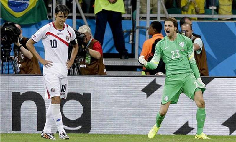 Ez meg is történt, azonban még a hosszabbítás utolsó pillantaiban Louis Van Gaal holland szakvezető képes volt olyat húzni, amely döntően befolyásolta a végkifejletet: utolsó cseréjét Tim Krul kapus bevetésére használta fel. A végén ziccert hárító Jasper Cillessen helyére beálló hálóőr teljesen felpaprikázva, a 120 perc alatt fizikailag és mentálisan is megviselt tizenegyeslövő ellenfeleket hergelve állt a gólvonalra, és a második körben hárította Ruiz próbálkozását, majd az ötödikben Umana lövését is kitolta, így Hollandia először nyert meg hosszabbításos meccset a vb-k történetében.
