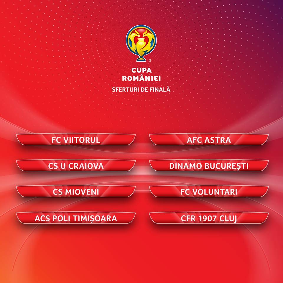 A sorozat ezen szakaszába korábban egyedüli másodosztályos csapatként továbbjutott Mioveni a Voluntari-t fogadja majd, míg a román bajnok Giurgiui Astra a Liga 1-ben listavezető Viitorul, a Dinamo pedig a Craiova vendége lesz március 28-29-én.