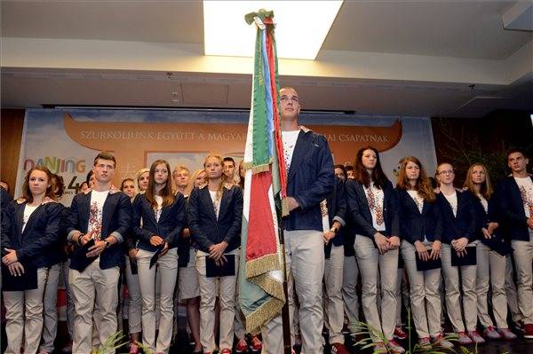Az olimpiai bajnokok nemzetiszínű zászlóját az egyik nankingi éremesélyes, Halász Bence kalapácsvető vette át Gergely István kétszeres olimpiai bajnok vízilabdázótól.