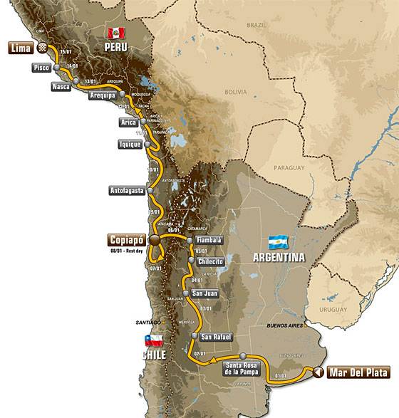 Az argentínai Mar del Platában 71 autó, 185 motor, 76 kamion és 33 quad vág neki az összesen 8373 kilométeres futamnak – ebből a motorosoknak 4406 kilométer, az autósoknak 4191 kilométer lesz a gyorsasági szakaszok hossza. A résztvevők az első napon dűnés szakaszt teljesítenek, majd északnak tartanak Argentínában, átkelnek az Andokon, aztán január 8-án, az első teljes chilei szakasz után pihennek egy napot Copiápóban. Ezt követően megint északnak veszik az irányt, hogy az utolsó napokon Peruban is versenyezve megérkezzenek a limai célba. A leghosszabb, 556 kilométeres gyorsasági szakaszt január 10-én Chilében, Antofagasta és Iquique között kell teljesíteniük a résztvevőknek.