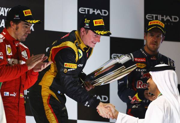 Abu-dzabi Nagydíj, pontszerzők: 1. Kimi Räikkönen (finn, Lotus–Renault), 2. Fernando Alonso (spanyol, Ferrari), 3. Sebastian Vettel (német, Red Bull–Renault), 4. Jenson Button (brit, McLaren–Mercedes), 5. Pastor Maldonado (venezuelai, Williams–Renault), 6. Kobajasi Kamui (japán, Sauber–Ferrari), 7. Felipe Massa (brazil, Ferrari), 8. Bruno Senna (brazil, Williams–Renault), 9. Paul di Resta (brit, Force India–Mercedes), 10. Daniel Ricciardo (ausztrál, Toro Rosso–Ferrari). Az összetett pontverseny élcsoportja, pilóták: 1. Vettel 255 pont, 2. Alonso 245, 3. Räikkönen 198, 4. Mark Webber (ausztrál, Red Bull–Renault) 167, 5. Lewis Hamilton (brit, McLaren–Mercedes) 165, 6. Button 153. Konstruktőrök: 1. Red Bull–Renault 422, 2. Ferrari 340, 3. McLaren–Mercedes 318, 4. Lotus–Renault 288, 5. Mercedes 136, 6. Sauber–Ferrari 124.