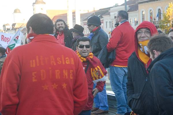 Bár előzetesen 2000 török szurkoló érkezéséről szóltak a híradások, Kolozsvár belvárosában legfeljebb néhány tucat Galata-drukker lézengett. A Főtéren unatkozó török szurkolók egyik csoportja ugyanakkor bekapcsolódott az éppen ott zajló, a verespataki bányaprojekt ellen tiltakozó tüntetésbe. A tiltakozók éppen Puiu Haşotti kulturális miniszter képmását dobálták zöld paradicsommal, így aztán amikor a török bajnokcsapat szurkolói megtudták, miről van szó, örömmel szálltak be a dobálózós mókába. Sőt a tárcavezetőt szidó rigmusok skandálását is jó szórakozásnak találták.