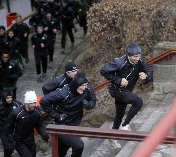 A Fradi játékosai a Medve-tó körül lebonyolított intenzív futással kezdték a munkát, tegnap pedig szállodájuk edzőtermében erősítettek.