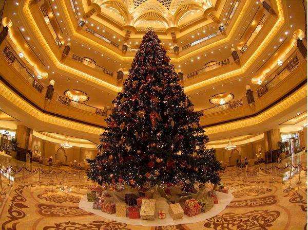 A 13 méter magas fát a luxushotel rotundájában, kör alakú kupolás dísztermében helyezték el, ezüstgirlandok és ékszerek díszítik, ezer fénnyel csillog. A dekorációt szolgáltató ékszerész büszkén jelentette be, hogy összesen 181 gyémánt-, gyöngy-, smaragd-, zafír- és más drágakő ékszert biztosított a nemes célra.