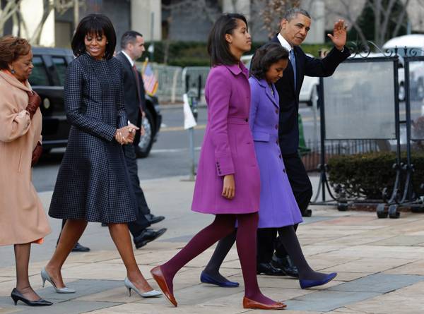 Vasárnap kékes árnyalatú kardigánt és ruhát viselt, akárcsak idősebbik lánya, Malia. Sasha, a kisebbik lány rózsaszín csipkeruhát választott. Az Obama lányok közül Malia a kifinomultabb összeállításokat kedveli, Sasha pedig egyértelműen bátrabb nővérénél, és feltűnőbb darabokat hord – ezt vasárnapi és hétfői ruhaválasztásuk is alátámasztja. A nyilvános eskütételre Malia magenta színű (élénk rózsaszín) kabátot és ibolya színű harisnyát választott, Sasha pedig egy lila kabát és szürke harisnya mellett döntött, és feltűnő nyaklánccal tette teljessé az összeállítást. Michelle Obama, aki hétfőn is maradt a kékes árnyalatoknál, kockás Thom Browne-kabátot és ruhát viselt, ezen kívül új frizurájával is felhívta magára a figyelmet: a beiktatási ünnepségre ugyanis frufrut vágatott. A hétfő estti bálon piros, Jason Wu által készített estélyiben jelent meg.