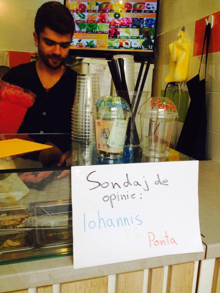 HÍRKÉP – Kolozsvári vendéglátó-ipari egységek is bekapcsolódtak az államfő-választási kampányba az utolsó száz méteren: különbejáratú „közvélemény-kutatást” végeznek. Az egyik belvárosi kávézóban például Johannis és Ponta feliratú műanyag pohárba várták a vendégektől a borravalót.