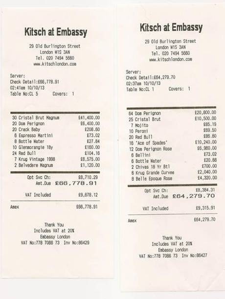Az igazi győztes mindazonáltal a szórakozóhely lett: rekordbevétel ütötte pincérei markát. „Már a 10–15 ezer fontos számla is ritkaságnak számít, nem hogy két 65 ezres” – idézte a The Daily Telegraph című brit lap pénteken a klub szóvivőjét. Ami az italokat illeti, elfogyott egyebek közt 64 palack Dom Perignon pezsgő, 25 Crystal pezsgő, 16 üveg Armand de Brignac Ace of Spades pezsgő, 12 palack Dom Perignon Rose, 10 üveg Peroni, 20 doboz Red Bull. A két társaság azért vizet is ivott, de nem túl sokat: ásványvízből csak nyolc palackkal rendelt.