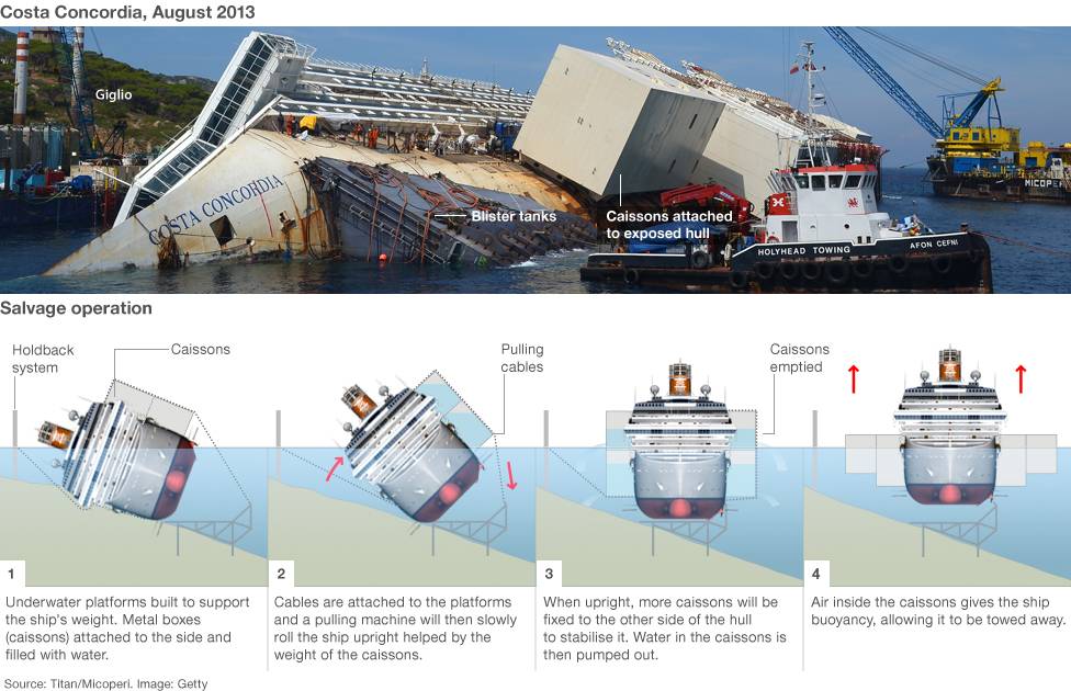 A műszaki szakértők beszámolója szerint a hajó mozgatása három fázisból áll. Az első során emelték fel a hajót a sziklákról. Amikor a hajó már húsz fokos szögben megemelkedik, a Costa Concordia víz feletti oldalára rögzített tartályok elérik a tengerszintet, és automatikusan megtelnek vízzel. Így lassítják és egyensúlyozzák a hajótest dőlését. A harmadik fázis az lesz, amikor a Costa Concordia \"ráül\" az alatta harminc méter mélységben épített talapzatra.