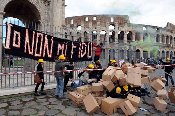 egy összeomlott fallal is fel akarták hívni a figyelmet a nemrég Pompejiben összedőlt házra, valamint arra, hogy a kormány a korábbinál kevesebb pénzzel támogatja a kulturális örökség ápolását.