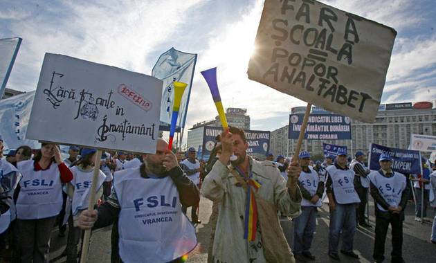 „Mentsétek meg az oktatást!” – állt azoknak a tanügyi dolgozóknak a pólóján, akik az első sorban vonultak szerdán a Szabad Tanügyi Szakszervezetek Tömörülése (FSLI) által szervezett bukaresti tüntetésen, amelyen a hivatalos becslések szerint mintegy hétezren vettek részt. A tiltakozók reggel a Győzelem téren gyülekeztek, sípokkal, zászlókkal, transzparensekkel felszerelkezve. „Iskola nélkül analfabéta a nép”, „Ha meghalunk mi, meghaltok ti is” – állt egyebek mellett utóbbiakon.